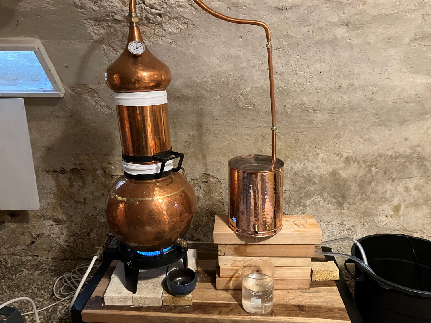Je conduis la phase d’évaporation avec des températures de 80 à 90° – vapeur douce. Dans la phase de condensation par refroidissement je surveille attentivement la température du distillat qui ne doit jamais dépasser 30-40°. -