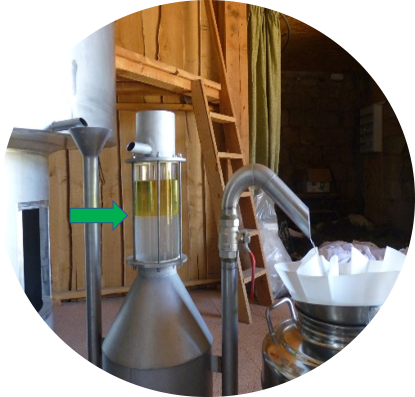 Dans la phase de condensation, la vapeur se refroidit en traversant un serpentin. Cette vapeur imprégnée de molécules aromatiques se condense alors pour donner deux produits distincts recueillis dans l’essencier ou vase florentin : l’hydrolat et l’huile essentielle. Par différence de densité, l’huile essentielle flotte à la surface.
