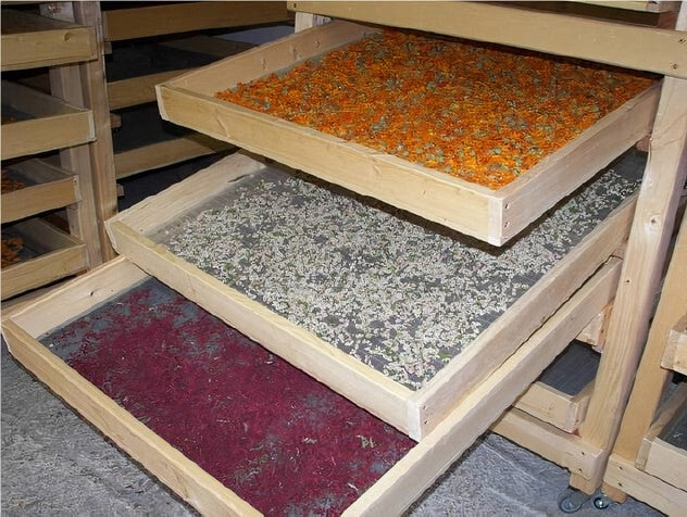 Les séchoirs se composent de deux types de claies : de grandes claies pour les plantes cueillies en grandes quantités, telles la Verveine et la Menthe, et de plus petites pour les fleurs comme les camomilles, la Mauve…